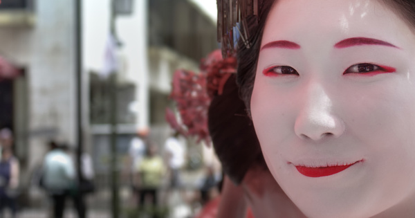 En la zona donde estábamos había tres geishas junto con un hombre de traje (quizá algún representante político) que intercambiaban regalos con los representantes de las carrozas. Desde que pasaba una carroza hasta la siguiente se refugiaban bajo una sombrilla en la acera así que la gente aprovechaba ese momento para sacarles algunas fotos. No hay muchas oportunidades de poder sacar un primer plano de una geisha!